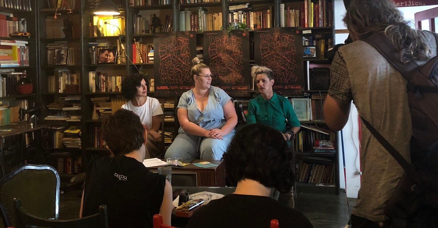 (Direktorica festivala Jelena Androić, glasnogovornica festivala Hana Galogaža Lanča i koordinatorica volontera Mirela Pašić na konferenciji za medije u Book Caffeu Dnevni boravak / Foto: Facebook LFF)