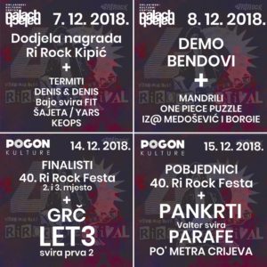 40. Ri Rock započinje u petak, 7.12., u OKC-u Palach dodjelom nagrada Ri Rock Kipić i nastupima bendova Denis & Denis, Termiti, Bajo svira Fit i Keops pod voditeljskom palicom Šajete koji će također i zasvirati uz svoj bend Yars.