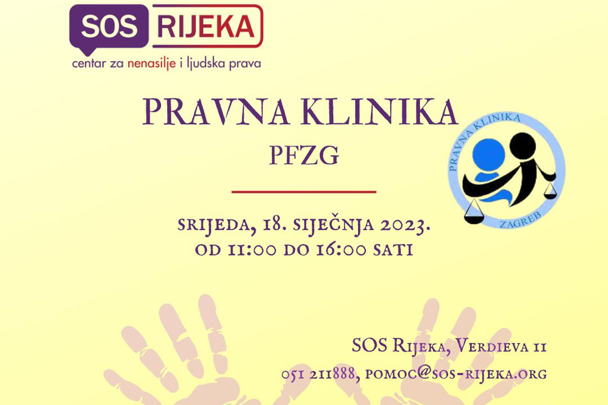 U srijedu, 18. siječnja, od 11 do 16 sati u prostorima prostorijama udruge SOS Rijeka – centar za nenasilje i ljudska prava, na adresi Verdijeva 11, bit će održano prvo ovogodišnje gostovanje Pravne klinike Pravnog fakulteta u Zagrebu ove godine.
