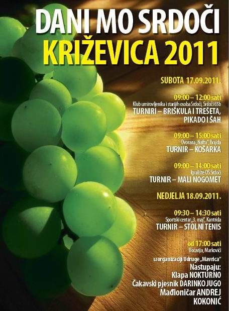 Križevica 2011. Ove godine su tijekom vikenda predviđeni sportski turniri u košarci, nogometu, stolnom tenisu, briškuli i trešeti, šahu i pikadu koji će se održati na nekoliko lokacija. Kulturno – zabavni program u organizaciji