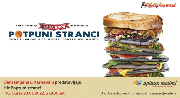 Teatar Luda kuća iz Zagreba stiže na scenu HKD-a na Sušaku u petak 28. siječnja s predstavom “Potpuni stranci”. S početkom u 19 i 30 sati publika će imati priliku uživati u adaptaciji jednog od najuspješnijih i najgledanijih talijanskih filmova ikad – “Perfetti sconosciuti”. U ovoj urnebesnoj predstavi sedmero dugogodišnjih prijatelja nalaze se kako bi uživali u rijetkoj pomrčini mjeseca uz jelo, piće i druženje kad odluče igrati neobičnu igru u kojoj među sobom dijele sve svoje pozive, poruke i e-mailove. Režiju i adaptaciju teksta predstave, čiji je sam uvod garancija dobrog provoda, potpisuje Rene Bitorajac koji će dijeliti pozornicu s Katarinom Baban, Petrom Dugandžić, Ivanom Đuričićem, Juditom Franković Brdar, Mladenom Kovačićem i Deanom Krivačićem.