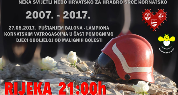 U nedjelju, 27. kolovoza 2017., u 21 sat, na riječkom lukobranu, kod zgrade Dezinsekcije, bit će organizirano puštanje lampiona u zrak u spomen na 10. obljetnicu kornatske tragedije, u sklopu projekta „Srce kornatsko“, koji organiziraju Dobrovoljno vatrogasno društvo Vodice, Malonogometni klub Heroji 2007. i Vatrogasna zajednica Šibensko-kninske županije.