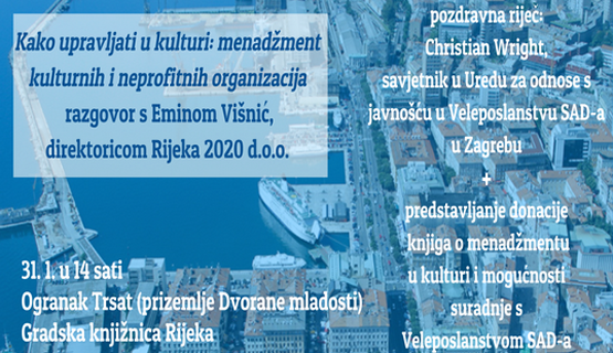 U sklopu programa American Corner, u utorak, 31. siječnja u 14 sati, u Ogranku Trsat Gradske knjižnice Rijeka održat će se razgovor s Eminom Višnić, direktoricom tvrtke Rijeka 2020, o menadžmentu kulturnih i neprofitnih organizacija.
