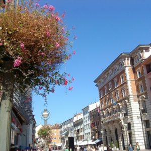 cvjetnim lončanicama na kandelabrima šarene pelargonije, bidensi, begonije i