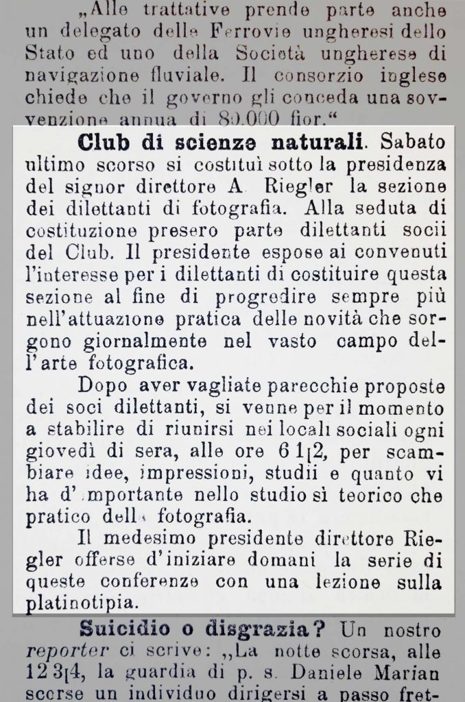 Naime, 9. siječnja 1897. godine u zgradi tadašnje Mađarske gimnazije u Rijeci, u kojoj je danas Srednja talijanska škola Rijeka – Scuola media superiore italiana Fiume, na inicijativu Sándora Alexandera Rieglera, ravnatelja te gimnazije, i Petera Salchera, uglednog profesora fizike na Mornaričkoj akademiji austrougarske vojske, osnovana je fotografska sekcija u Klubu prirodnih znanosti.