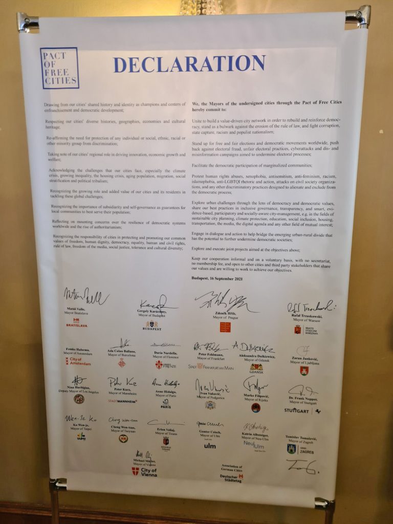 Deklaraciju su, uz gradonačelnika Filipovića, potpisali i gradonačelnici Amsterdama, Barcelone, Düsseldorfa, Firence, Fort Wortha, Frankfurta, Gdanska, Ljubljane, Los Angelesa, Mannheima, Pariza, Podgorice, Stuttgarda, Taipeia, Taoyuana, Tirane, Ulma, Neu- Ulma, Beča, Zagreba te predsjednik Njemačkog udruženja gradova, uživo ili virtualno.