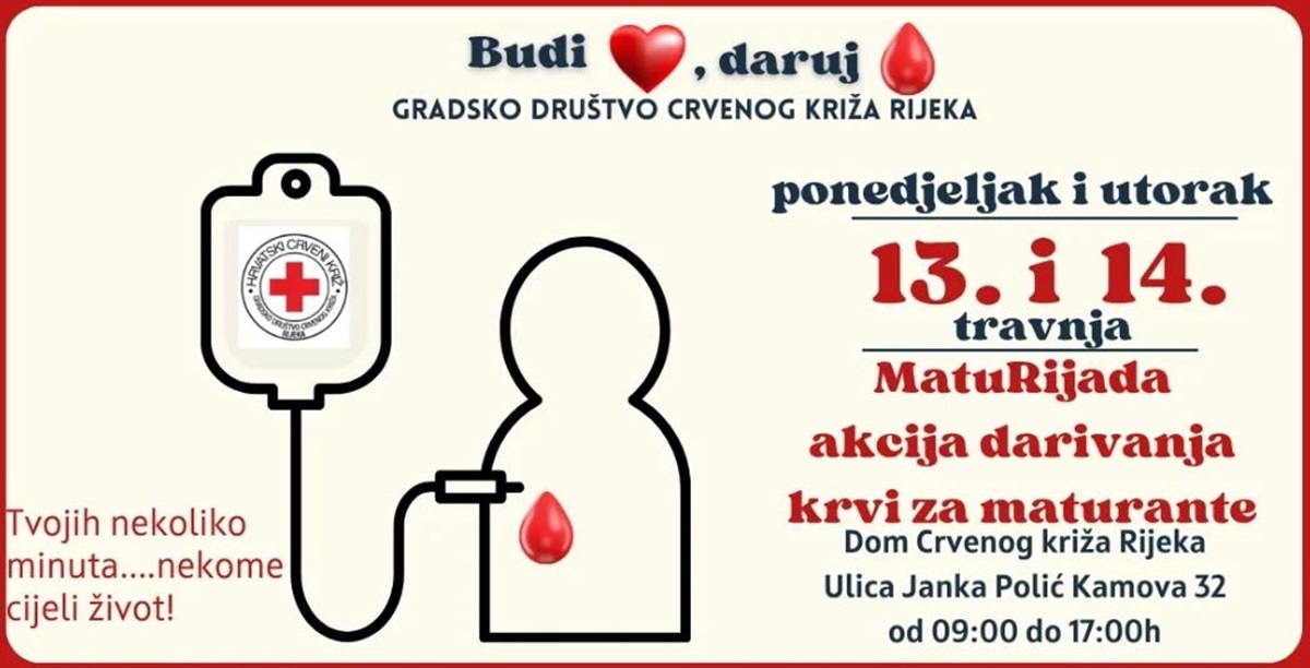 U ponedjeljak i utorak, 13. i 14. travnja od 9 do 17 sati u Domu Crvenog križa na Pećinama (Janka Polića Kamova 32), održati će se akcija darivanja krvi namijenjena učenicima završnih razreda srednjih škola s područja Rijeke.