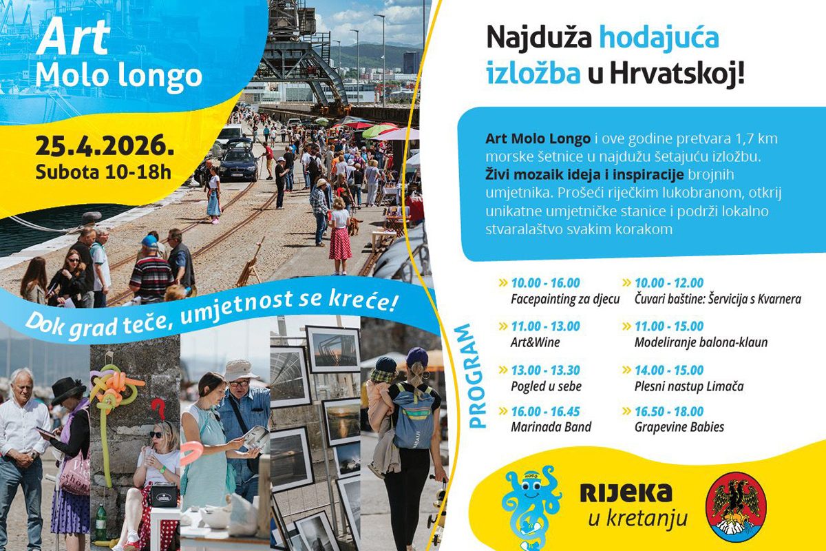 Manifestacija Art Molo longo vraća se i ove godine na riječki lukobran, gdje će se u subotu, 25. travnja 2026. godine, od 10 do 18 sati šetnica duga 1,7 kilometara pretvoriti u najdužu hodajuću izložbu u Hrvatskoj.