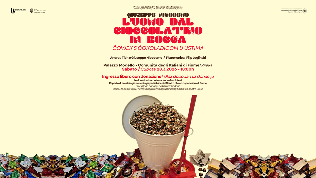 Comunità degli Italiani di Fiume – Zajednica Talijana Rijeka organizira dobrotvornu kazališnu predstavu L’uomo dal cioccolatino in bocca / Čovjek s čokoladicom u ustima, autora i izvođača Giuseppea Nicodema, prvaka Talijanske drame HNK Ivana pl. Zajca.