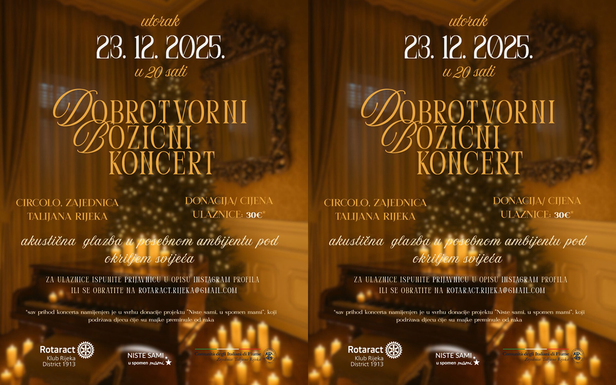 U utorak 23. prosinca 2025. godine u Circolu, Zajednici Talijana Rijeka (Uljarska ulica 1, 51 000 Rijeka) s početkom u 20:00 sati bit će održan Dobrotvorni božićni koncert u organizaciji Rotaract kluba Rijeka.