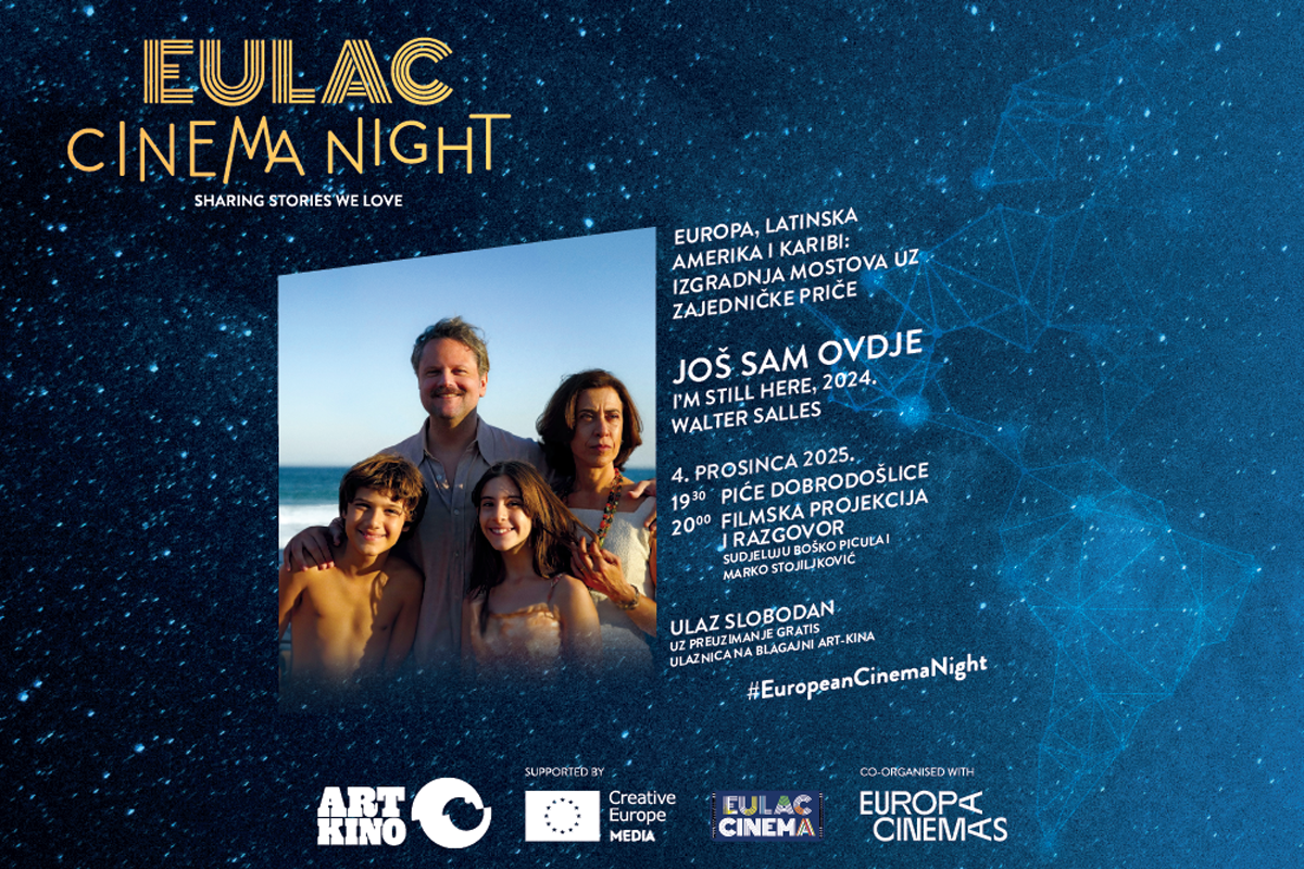 U sklopu programa europske mreže kina Europa Cinemas Preko ekrana: Europa susreće Latinsku Ameriku i Karibe, 4. prosinca s početkom u 20 sati u Art-kinu se održava posebna i za posjetitelje besplatna projekcija Oscarom nagrađenog brazilskog filma Još sam ovdje Waltera Sallesa, uz popratni razgovor o filmu u kojem će sudjelovati politolog i filmski kritičar Boško Picula te filmski kritičar Marko Stojiljković.