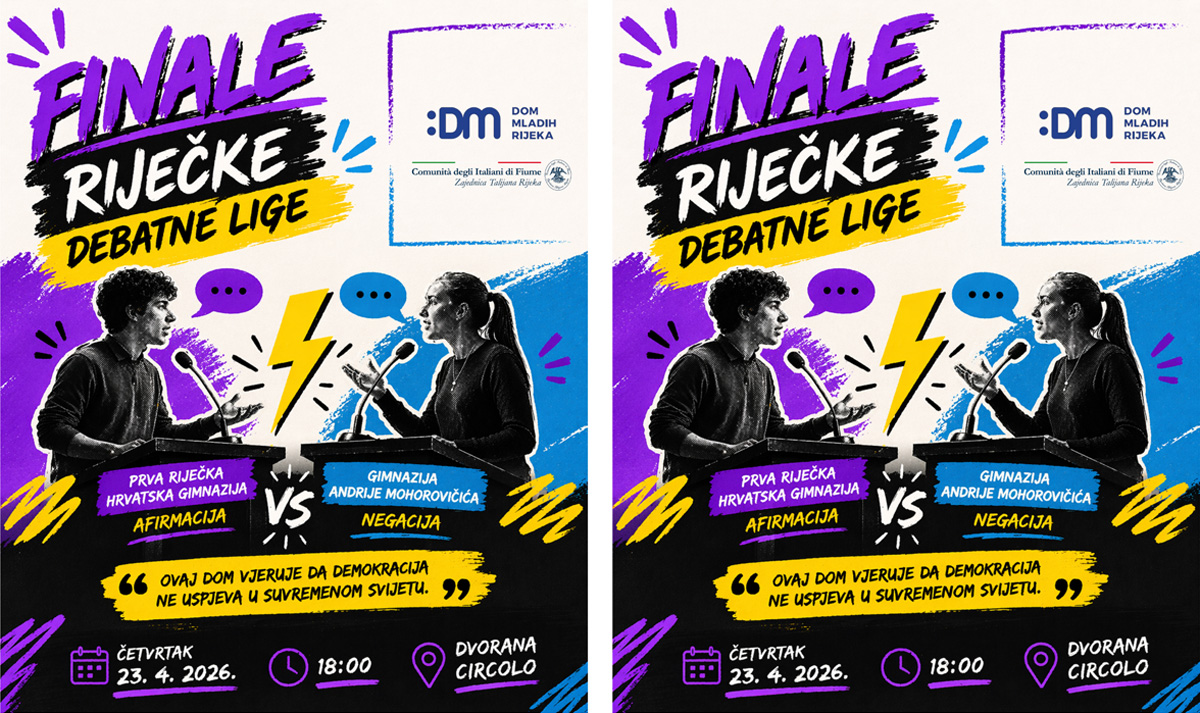 Najbolji mladi govornici riječkih srednjih škola odmjerit će snage u finalu Riječke debatne lige, koje će se održati u četvrtak, 23. travnja, s početkom u 18 sati u dvorani Circolo. Ovogodišnja završnica donosi sučeljavanje ekipa Prve riječke hrvatske gimnazije na afirmacijskoj strani i Gimnazije Andrije Mohorovičića na negacijskoj strani.