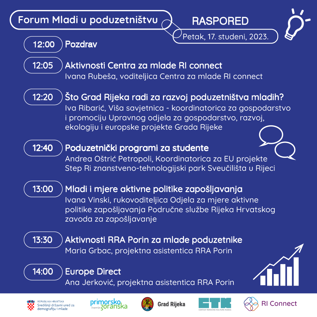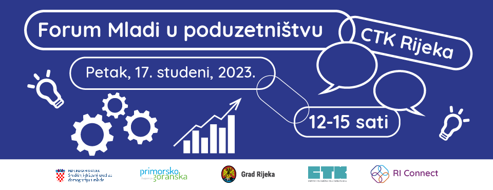 Forum „Mladi u poduzetništvu“ se provodi u sklopu projekta Centar za mlade RI connect, financiranog od strane Središnjeg državnog ureda za demografiju i mlade, Primorsko-goranske županije i Grada Rijeke.