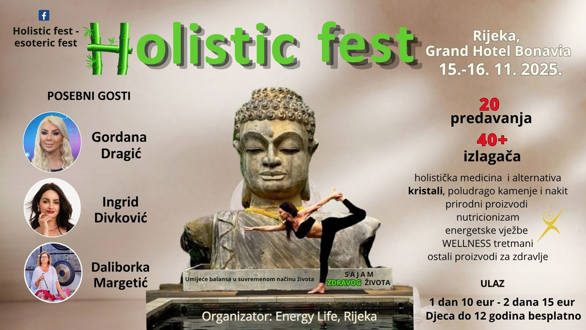 U Grand Hotela Bonavia u Rijeci u subotu i nedjelju, 15. i 16. studenoga, od 11 do 20 sati, bit će održano još jedno izdanje Holistic Festa, jedinstvenog događaja posvećenog zdravlju, duhovnosti i osobnom razvoju. Ovaj inspirativni vikend okupit će preko 40 izlagača i stručnjaka iz različitih holističkih područja, te donijeti više od 20 predavanja i radionica.