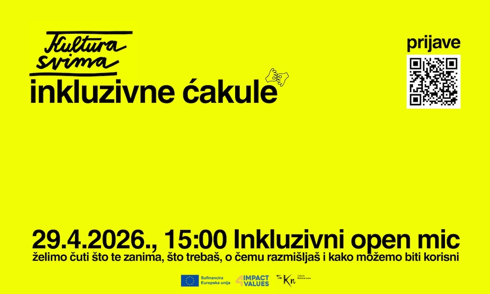 Posljednja travanjaska radionica Inkluzivni open mic, na rasporedu je 29. travnja, a riječ je o formatu otvorenog mikrofona za razgovore o inkluziji te modelima inkluziviranja u kulturi. Poziv za razgovor o interesima, potrebama te dijeljenje primjera dobrih praksi.