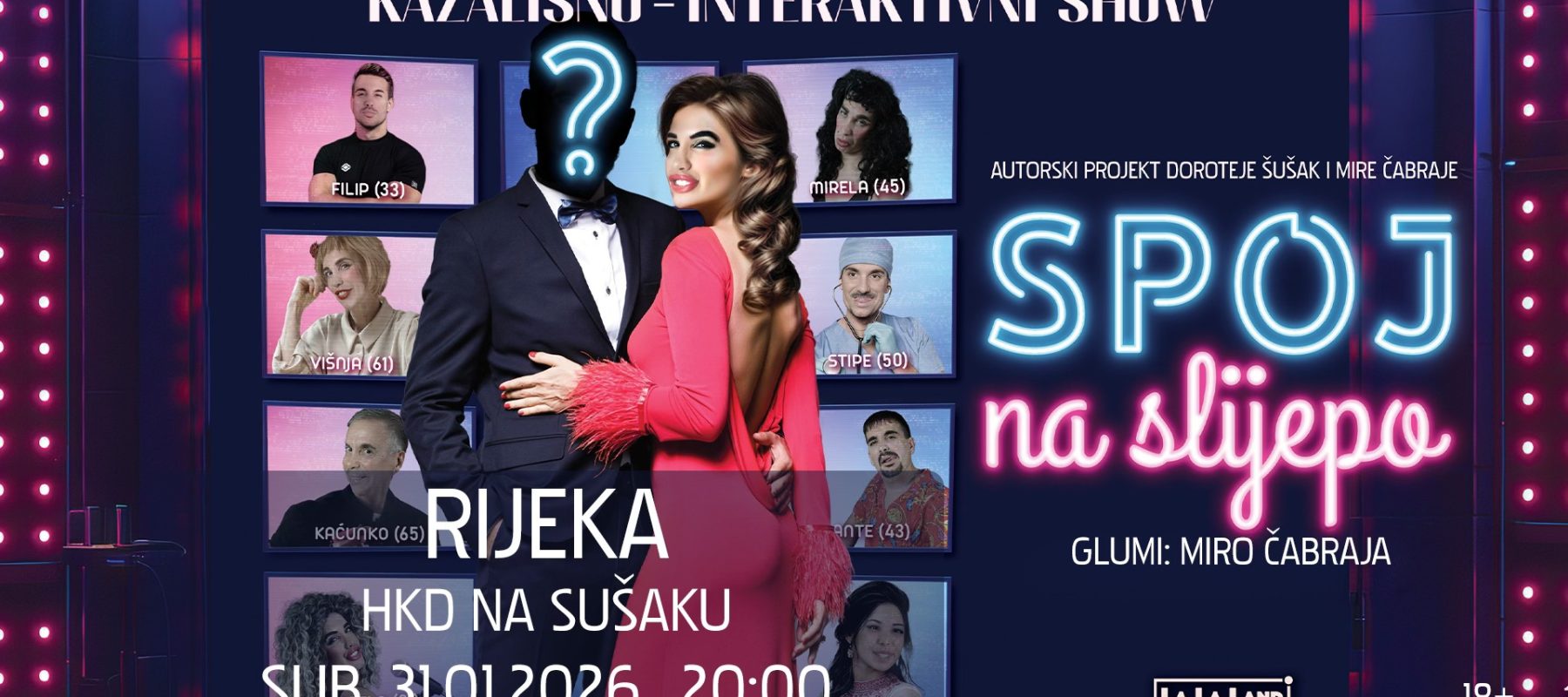 Hrvatski kulturni dom na Sušaku u subotu, 31. siječnja, ugostit će novi autorski projekt glumca Mire Čabraje i dramaturginje Doroteje Šušak pod nazivom „Spoj na slijepo“. Nakon uspjeha predstave „Baka ima dečka“, Čabraja se riječkoj publici predstavlja specifičnim kazališno-interaktivnim formatom koji je prvi takve vrste u Hrvatskoj.