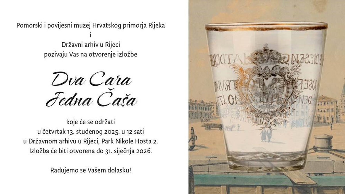 U četvrtak 13. studenog 2025. u 12 sati u Državnom arhivu Rijeka (Park Nikole Hosta 2) bit će otvorena izložba „Dva cara – jedna čaša“ autorica Margite Cvijetinović, Tee Perinčić i Antonelle Vlaše.