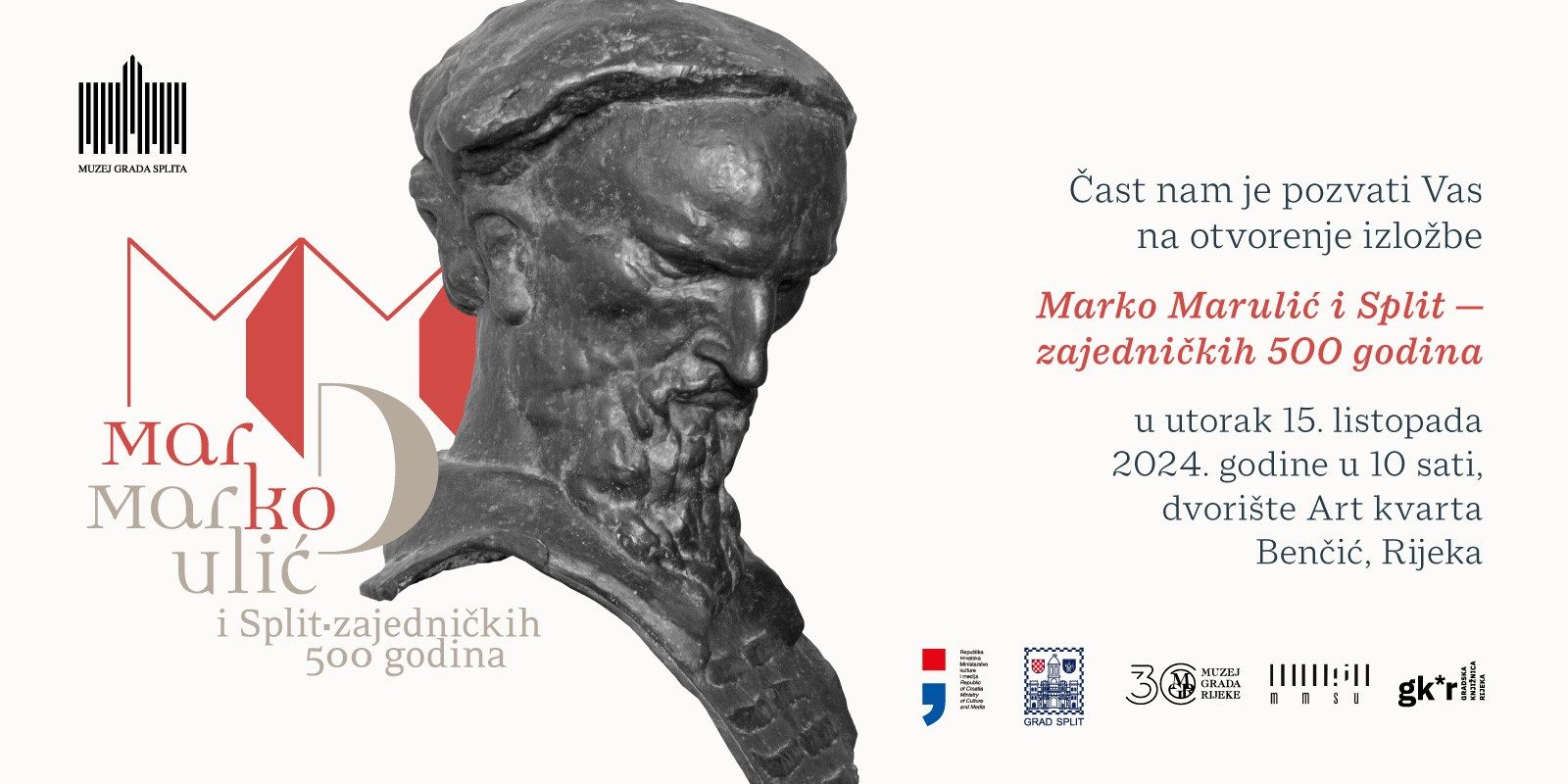 Kao uvertira Mjesecu hrvatske knjige u Gradskoj knjižnici Rijeka, a u povodu 500. obljetnice smrti Marka Marulića (1450. – 1524.), Muzej grada Splita organizira izložbu Marko Marulić i Split – zajedničkih 500 godina. Izložbom se želi podsjetiti na važnost splitskog začinjavca domaće pisane riječi u hrvatskoj i europskoj književnosti, također na njegovu aktualnost i svevremenost, tim više što je izložba osmišljena u godini posvećenoj Marku Maruliću.