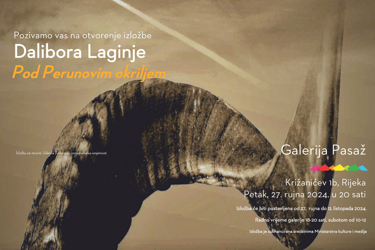 U Galeriji Pasaž (Križanićev prolaz, Rijeka) u petak, 27. rujna, u 20 sati bit će otvorena izložba Dalibora Laginje pod nazivom Pod Perunovim okriljem.