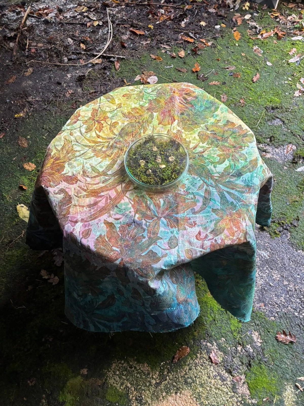 Kroz prostorne instalacije, batik tkanine, prirodne pigmente, crteže i pronađene predmete, autorica gradi vlastitu verziju šume – koja nije odredište, već proces – put prema dubljoj, tišoj, unutarnjoj istini.