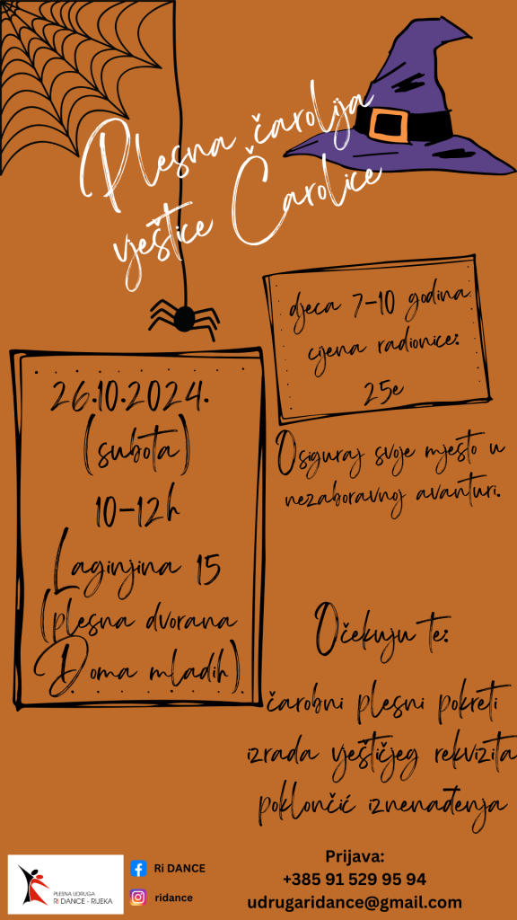 U subotu, 26. listopada 2024. od 10:00 – 12:00h u plesnoj dvorani Doma mladih, Laginjina 15, održat će se jednodnevna plesno – scenska radionica pod nazivom “Plesna čarolija vještice Čarolice” namijenjena djevojčicama i dječacima od 1. – 4. razreda OŠ.