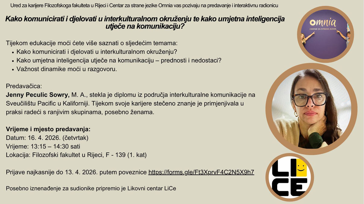 Ured za karijere Filozofskoga fakulteta u Rijeci i Centar za strane jezike Omnia pozivaju na predavanje i interaktivnu radionicu Kako komunicirati i djelovati u interkulturalnom okruženju te kako umjetna inteligencija utječe na komunikaciju?, što će se u četvrtak, 16. travnja s početkom u 13:15 sati na Filozofskom fakultetu u Rijeci F – 139 (1. kat).