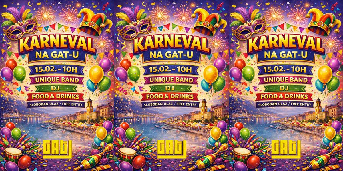Rijeka u nedjelju, 15. veljače, postaje pravo karnevalsko središte! Adamićev gat donosi manifestaciju Karneval na GATu u sklopu Riječkog karnevala, uz cjelodnevnu zabavu, živu glazbu i DJ setove.