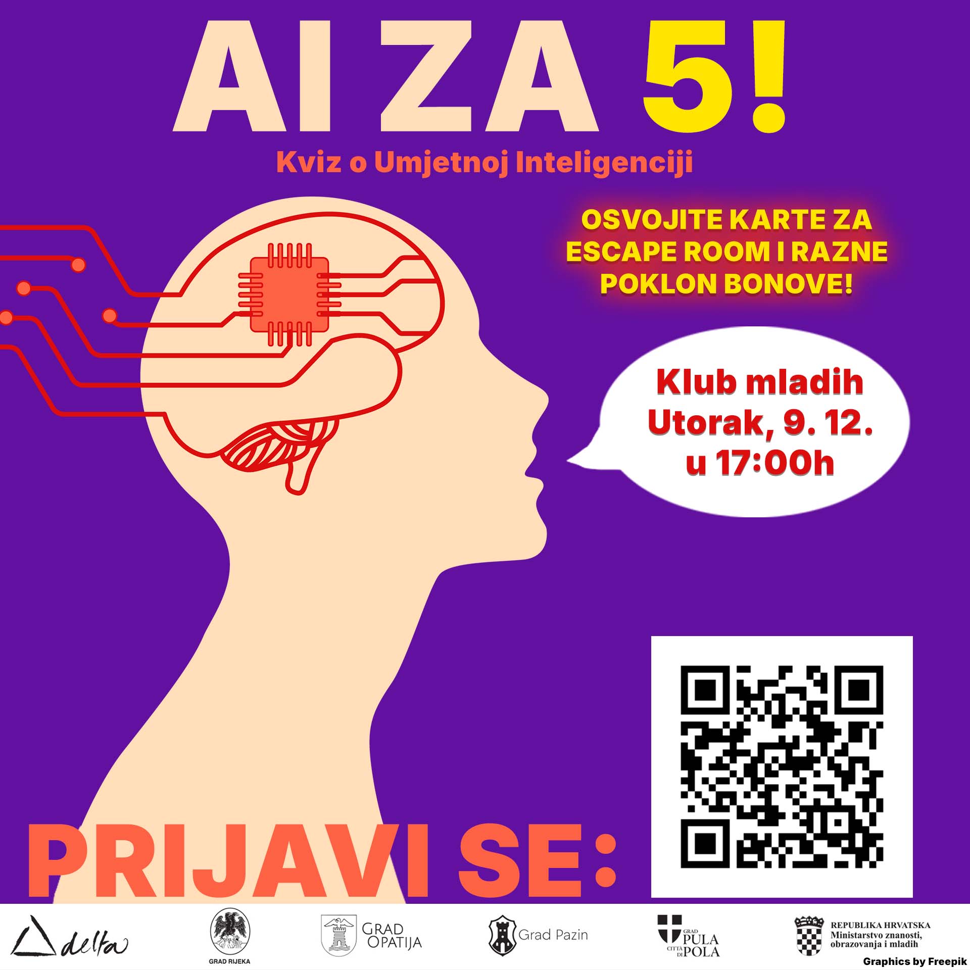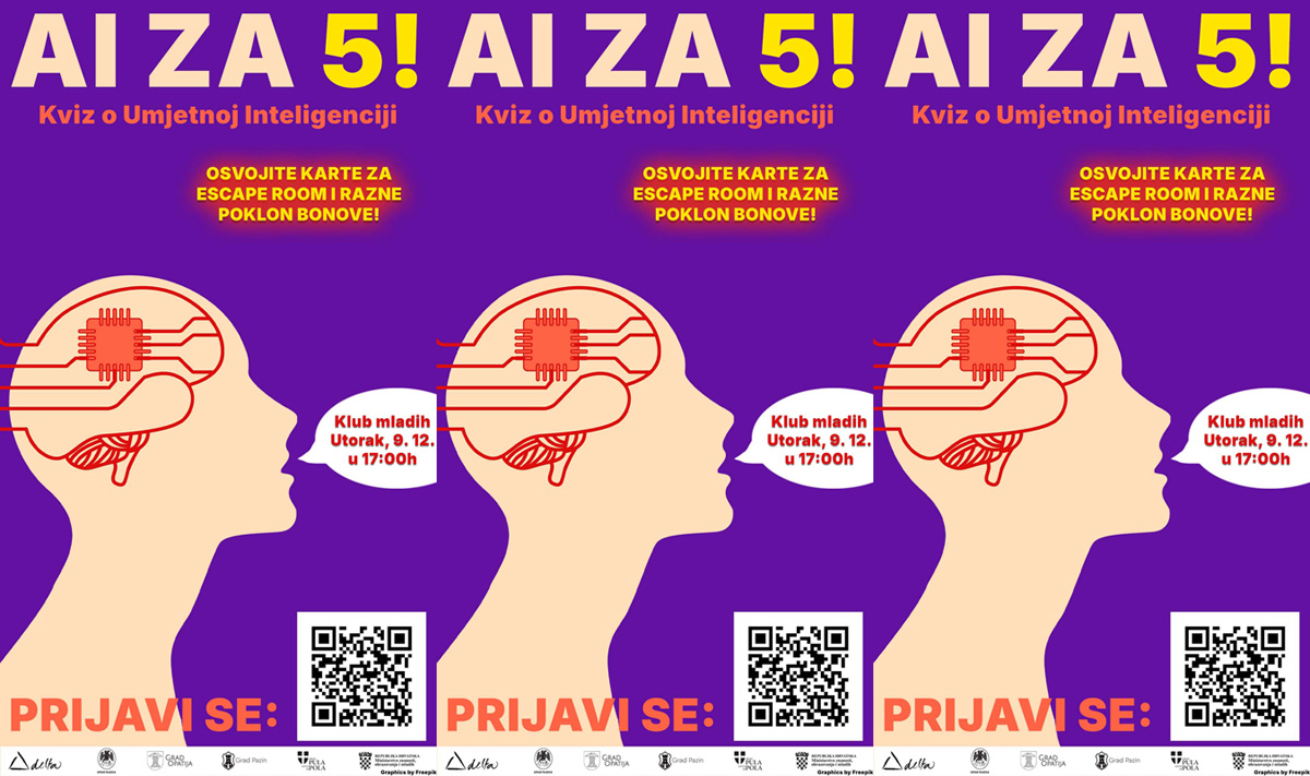 U utorak, 9. prosinca 2025., u Klubu mladih Rijeka (Erazma Barčića 9/A), bit će održan kviz pod nazivom “AI za 5!” s početkom u 17 sati.