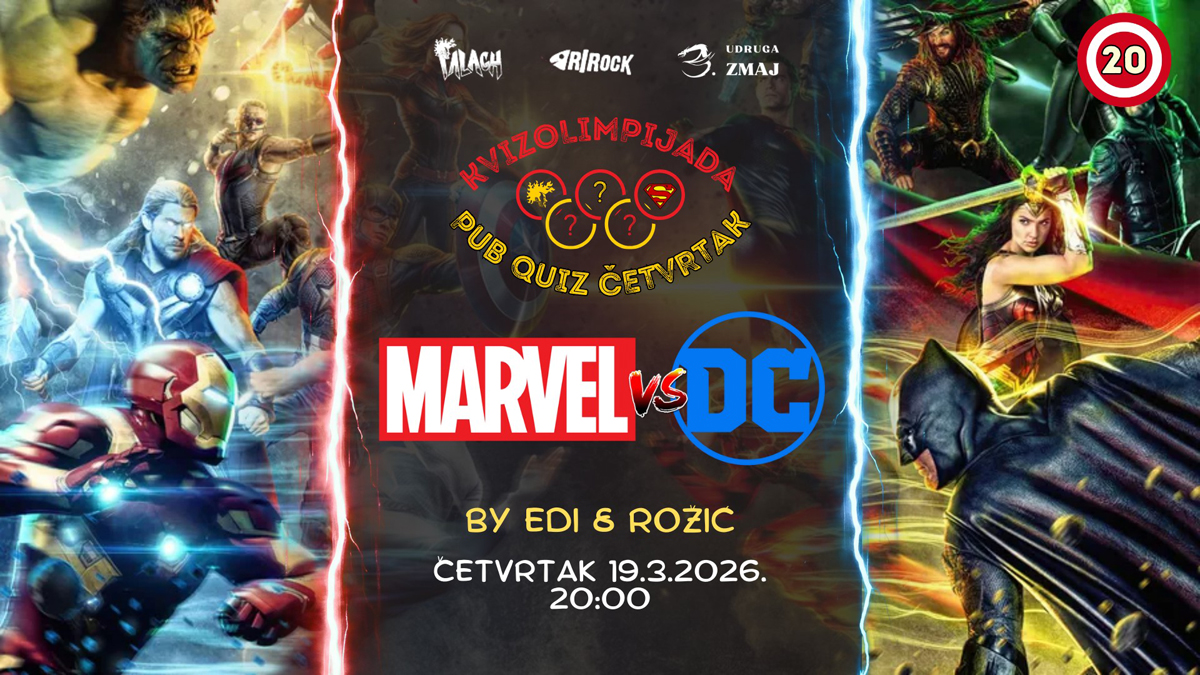 Ovoga puta tema večeri je veliki superjunački obračun: Marvel protiv DC-a. Kviz vode Edi (Udruga 3. zmaj) i Mateo (Udruga Ri Rock), a sudionike očekuju pitanja iz filmova, stripova, serija i animiranih filmova, uz prepoznavanje likova, negativaca, origin priča i easter eggova iz dvaju najpoznatijih stripovskih univerzuma.
