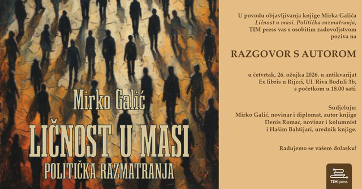 U četvrtak, 26. ožujka 2026. u Antikvarijatu Ex libris u Rijeci, Ul. Riva Boduli 3b, s početkom u 18.00 sati bit će održana promocija i razgovor o knjizi Mirka Galića „Ličnost u masi. Politička razmatranja“, objavljenoj u izdanju TIM press.