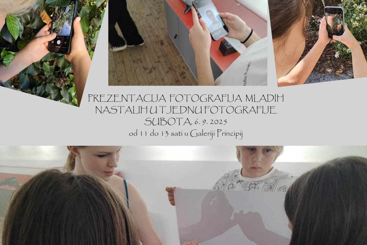 U subotu, 6. rujna, od 11 do 13 sati u Galeriji Principij bit će održana prezentacija radova mladih nastalih tijekom radionica u Tjednu fotografije mladih, u organizaciji Fotokluba Rijeka.
