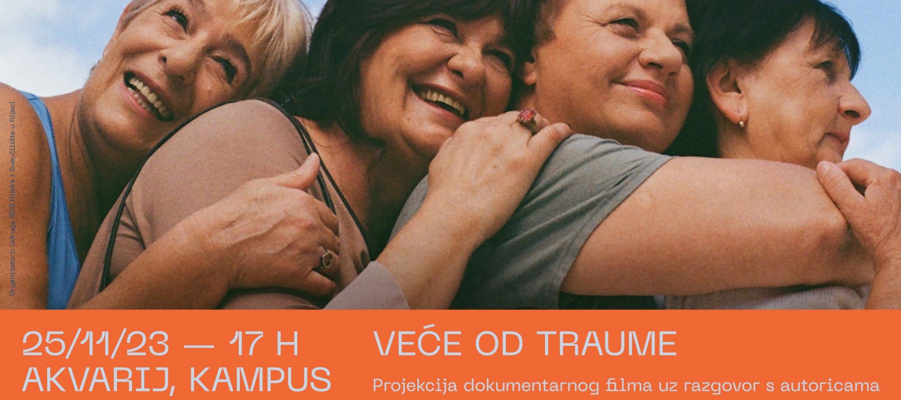 Povodom Međunarodnog dana borbe protiv nasilja nad ženama, SOS Rijeka i Sveučilište u Rijeci pozivaju na projekciju višestruko nagrađenog dokumentarnog filma “Veće od traume” uz razgovor s autoricama filma Vedranom Pribačić i Mirtom Puhlovski u subotu, 25. studenog 2023. s početkom u 17 sati u Akvariju na Kampusu Sveučilišta u Rijeci.