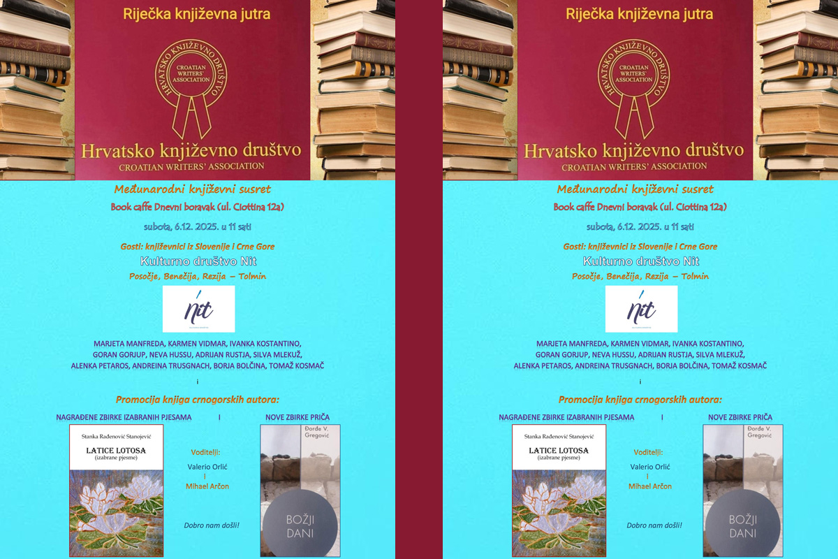 “Riječka književna jutra” u subotu, 6. prosinca 2025. godine, u 11:00 sati, u Book Caffeu Dnevni boravak (Ciottina 12a) donose međunarodni književni susret, koji će okupiti slovenske i crnogorske književnike.