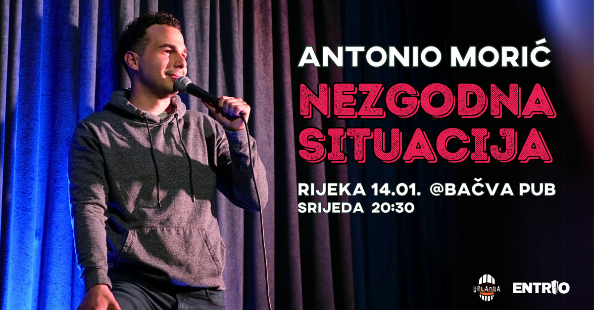 Riječka stand-up komičar Antonio Morić u srijedu 14. siječnja u Bačva Pubu izvest će svoj show pod nazivom „Nezgodna situacija“. Nastup u organizaciji platformi Urlaona i Rijeka Smijeha bavi se temama iz svakodnevnog života, od potrage za partnericom do neplaniranog roditeljstva, uz obećanje da će se granice humora definitivno prijeći.