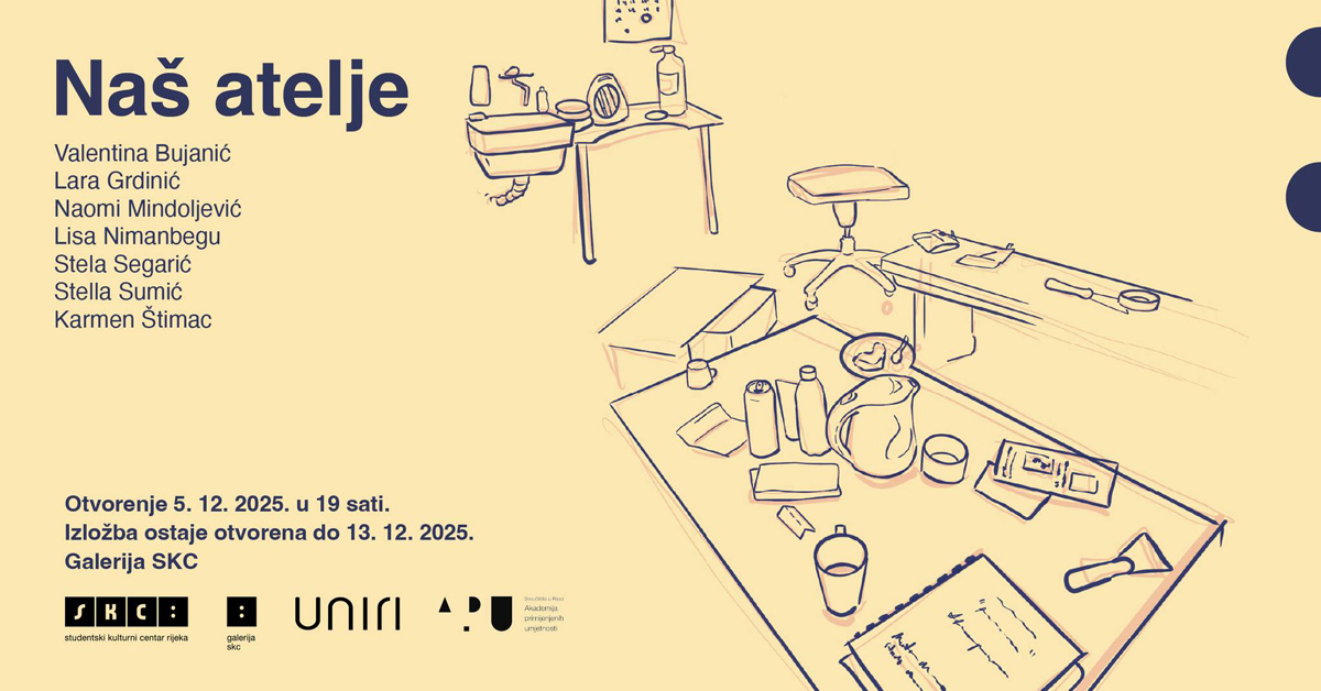 Studentski kulturni centar (SKC) Rijeka i Galerija SKC pozivaju na otvorenje zanimljive skupne izložbe naziva “Naš atelje”. Riječ je o radovima sedam studentica prve godine kiparstva s Akademije primijenjenih umjetnosti (APURI).