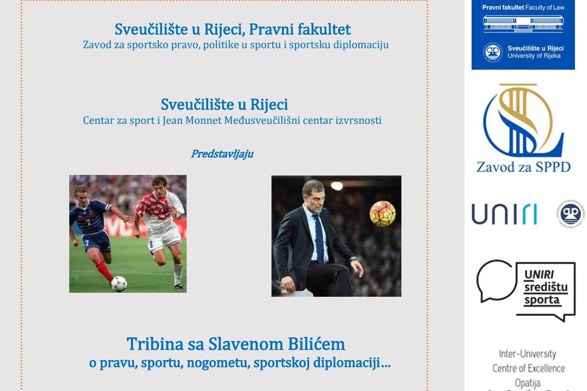 Na Pravnom fakultetu u Rijeci, u četvrtak 18. 12. 2025. s početkom u 10:30 sati u Plavoj dvorani bit će održana tribinao pravu, sportu i sportskoj diplomaciji s proslavljenim Vatrenim, izbornikom i danas uglednim trenerom, voditeljem i TV komentatorom Slavenom Bilićem.