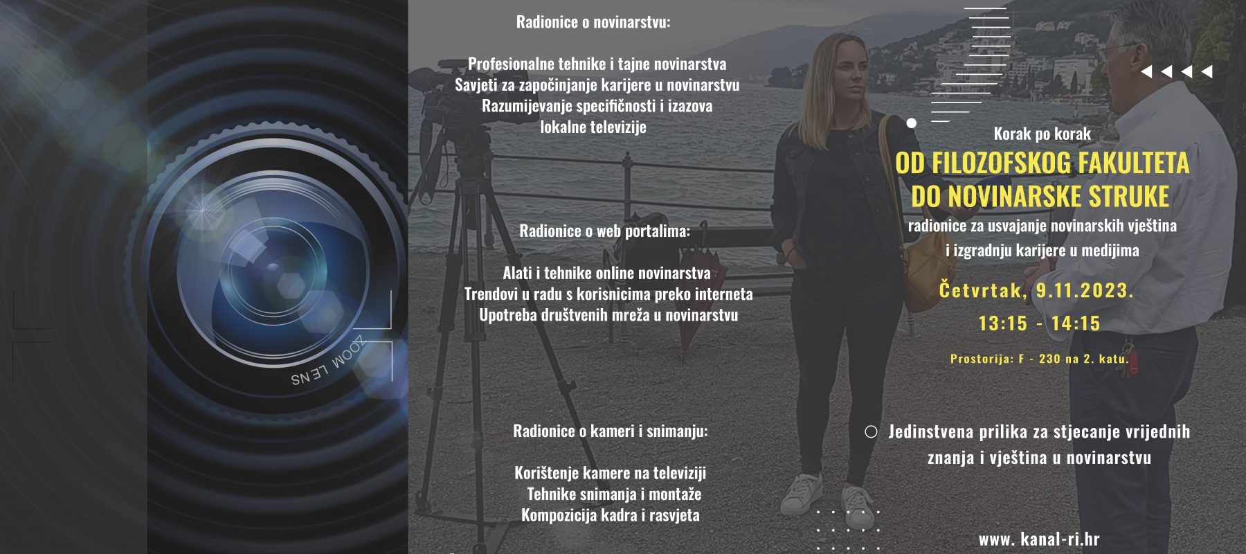 Kanal Ri i Ured za karijere Filozofskoga fakulteta u Rijeci pozivaju studente i studentice Sveučilišta u Rijeci na radionicu Usvajanje novinarskih vještina i izgradnja karijere u medijima.