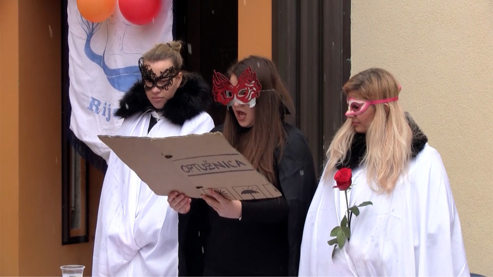 Gospodin savršeni, između ostalog, optužen je za terorističke napade u svijetu i migrantsku krizu. Karnevalski sud proglasio ga je krivim po svim točkama optužbe pa je Gospodin Savršeni obješen na pročelje zgrade u dvorištu fakulteta gdje će čekati izvršenje kazne spaljivanjem u riječkom akvatoriju.