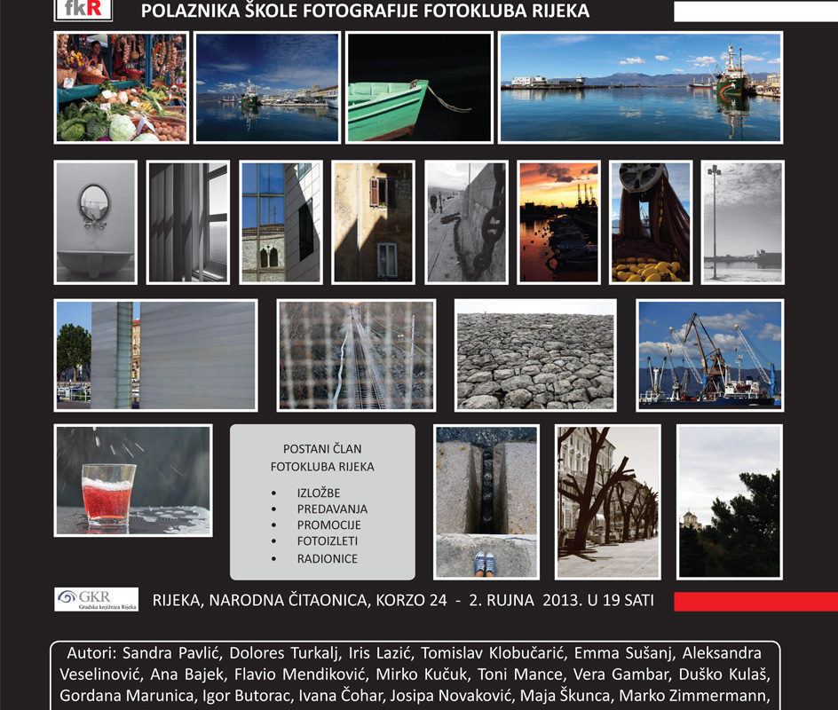 Pozivaju se svi zainteresirani građani te članovi Kluba da svojim dolasko daju podršku fotografima. Na izložbi će biti predstavljeni radovi čiji su autori: Sandra Pavlić, Dolores Turkalj, Iris Lazić, Tomislav Klobučarić, Emma Sušanj, Aleksandra Veselinović, Ana Bajek, Flavio Mendiković, Mirko Kučuk, Toni Mance, Vera Gambar, Duško Kulaš, Gordana Marunica, Igor Butorac, Ivana Čohar, Josipa Novaković, Maja Škunca, Marko Zimmermann, Sandra Končarević i Toni Stipetić.