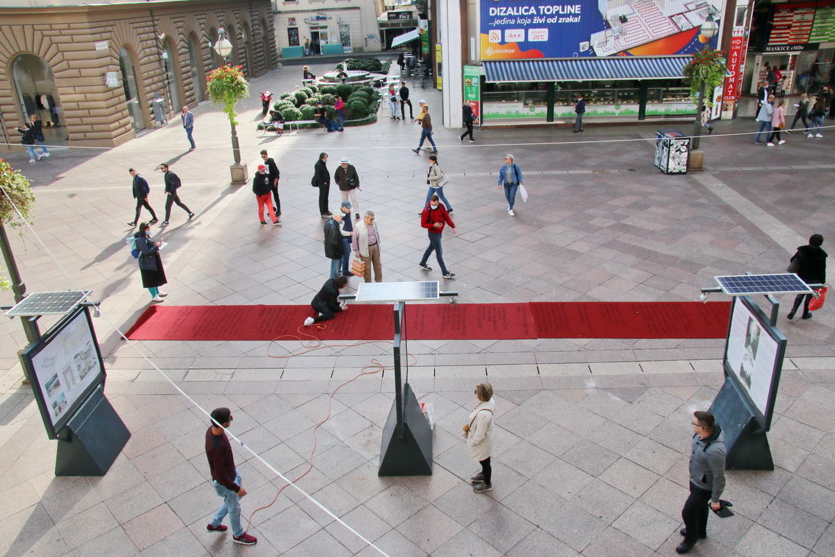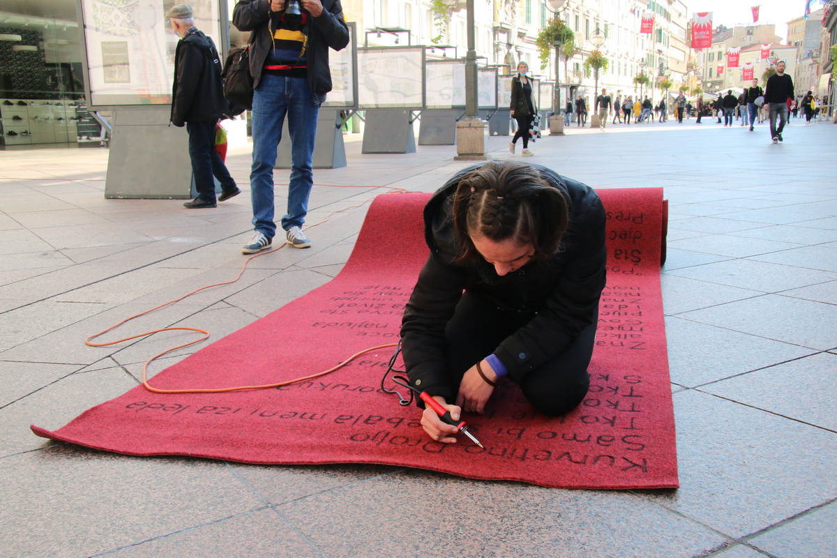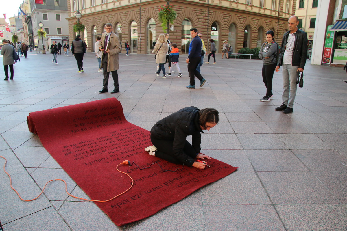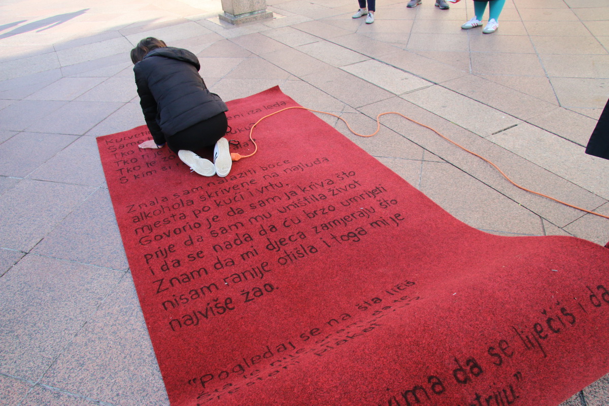 Performans je nastavak autoričinog nagrađivanog rada “Sram te i stid bilo”, a za cilj ima osvijestiti koliko zataškavamo problem nasilja u našem društvu, doslovno guramo nasilje pod tepih i kontinuirano gazimo ženska prava. Stoga je Žarković izradila crveni tepih s ispisanim zlostavljačkim SMS porukama koje je dobivala od strane jedne muške osobe.