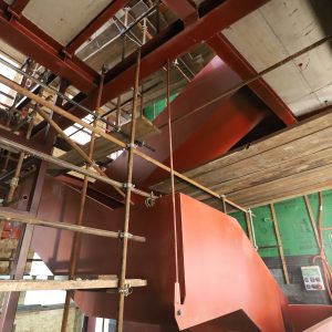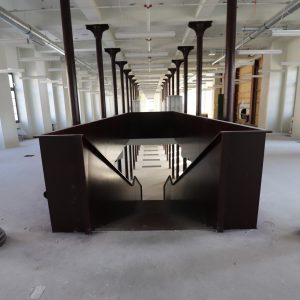 Svi građevinski radovi na konstrukciji osnovnog volumena T-objekta su izvedeni. Izvedena je i čelična konstrukcija krovišta, koja je specifična zbog nagiba objekta. Nakon izvedbe krovnog pokrova, krovnih prozora i ventilacijskih kutija te limarskih radova završavaju se obrtnički i instalaterski radovi u objektu. Izvedeno je gotovo 90% svih radova, odnosno izvedeni su gips-kartonski radovi na zidovima, radovi na izvedbi plivajućih podova, soboslikarski radovi gletanja i bojanja, postava keramike i sanitarne opreme u sanitarnim čvorovima objekta. Izvedene su sve strojarske instalacije grijanja, hlađenja i ventilacije te instalacije zaštite od požara uključujući i sprinkler sustav za gašenje požara. Izvedene su elektroinstalacije i montirana je rasvjeta objekta.