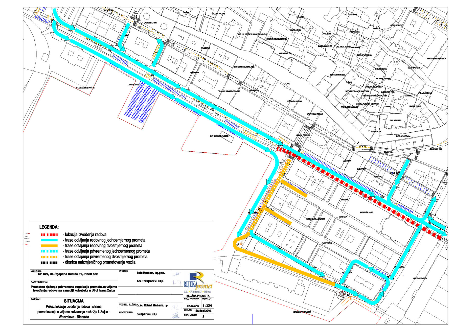 Radovi će se izvoditi svakog dana poslijepodne od 17:00 sati do slijedećeg dana ujutro do 05:00 sati. Budući da će za vrijeme izvođenja radova biti onemogućen ulaz vozila iz ulice Riva u ulicu Riva Boduli, sav promet u smjeru područja tržnice odvijati će se obilaznim smjerom kroz parkirališta Putnička obala i Riva boduli. U vrijeme izvođenja radova u ulici Riva Boduli, promet će se privremeno odvijati dvosmjerno, ali samo od raskrižja sa Demetrovom ulicom do raskrižja sa Verdijevom ulicom.