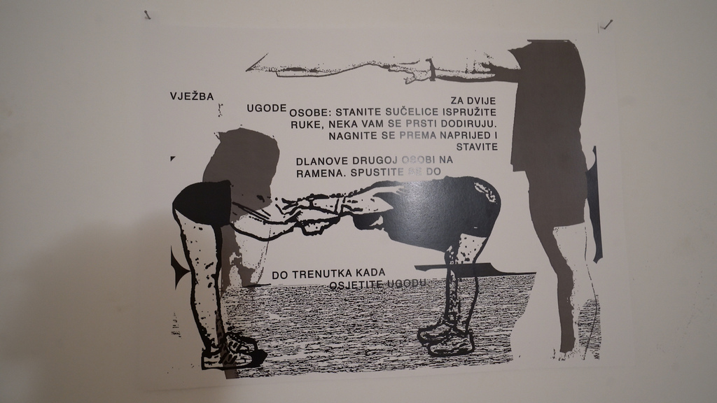 Zamišljena je kao izložba koju gradi publika prateći Elenine upute za izvođenje jednostavnih ili složenih vježbi i igara kako bi se fokus s galerijskog prostora skrenuo na ljude. Na taj način izložbeni prostor koncipiran kao mjesto iskustva (a ne prezentacije), nudi posjetiteljima i sudionicima direktno iskustvo vlastitog tijela i tijela druge osobe.
