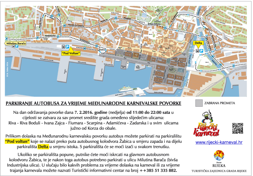 Prilikom dolaska na Međunarodnu karnevalsku povorku autobu se mogu parkirati na parkiralištu “Pod voltun” koje se nalazi preko puta autobusnog kolodvora Žabica u smjeru zapada i na parkiralištu Delta u smjeru istoka. S parkirališta će se moći izać u svakom trenutku. Ukoliko se parkirališta popune, putnike će se moći iskrcati na glavnom autobusnom kolodvoru Žabica, te je autobuse nakon toga potrebno parkirati u ulicu Milutina Barača (bivša Industrijska ulica). Za bilo kakve poteškoće za vrijeme dolaska i za vrijeme trajanja karnevala posjetitelji se mogu obratiti Turističkom informativnom centru na broj ++38551335882.
