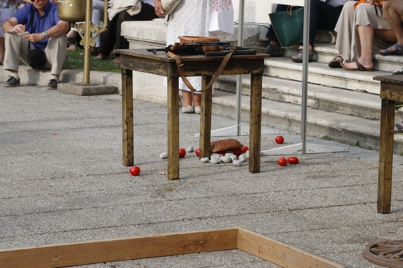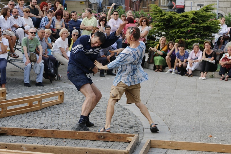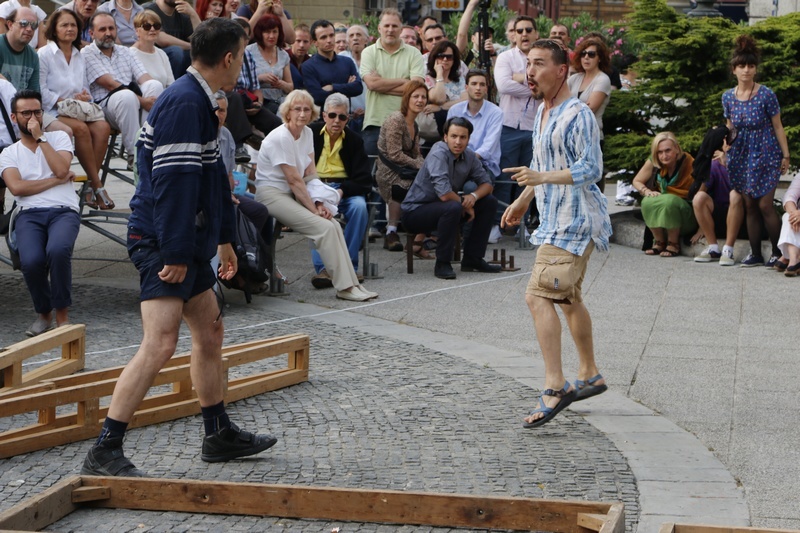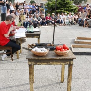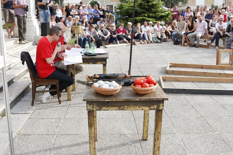 njih dvojicu, Frljić je pozvao gledatelje da ih, ako to žele, gađaju rajčicama