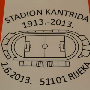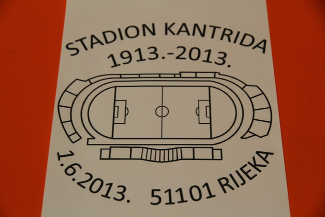 Udruga Slobodna Država Rijeka od 2006. godine redovito jednom godišnje izdaje prigodne markice. Nakon prošlogodišnje kojoj je tema bila stogodišnjica potonuća Titanica, ove godine tema je stadion Kantrida. Autor markice je poznati riječki filatelist Ivan Martinaš koji je za ovu prigodu iskoristio staru fotografiju stadiona, iznad koje se nalaze grbovi klubova koji su nekoć koristili stadion kao svoju bazu. To su Victoria, Olimpia, Gloria, Fiumana, Kvarner i Rijeka. Na prigodnoj kuverti nalazi se još jedna stara slika stadiona uz podjetnik na datum, sudionike i rezultat te utakmice.