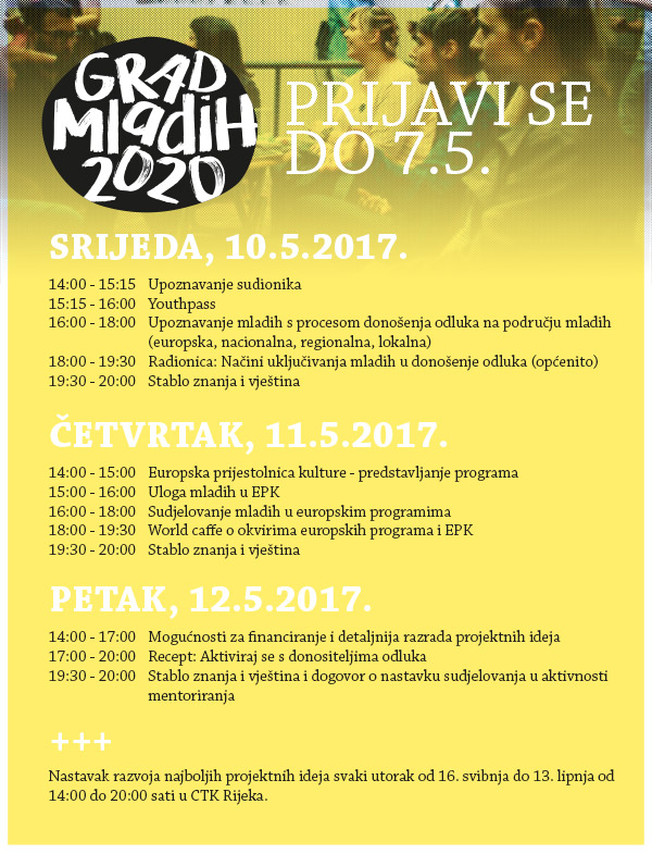 Projekt Grad mladih 2020 usmjeren je na poticanje mladih iz Rijeke i okolice na uključivanje i kreiranje kulturnih sadržaja s naglaskom na projekt EPK. Uključuje intenzivnu trodnevnu radionicu i program mentorstva, koja će biti održana od 10. do 12. svibnja. Mladi će biti upoznati s pojmovima ključnim za pisanje i provedbu projekata, procesom donošenja odluka i načinima uključivanja u te procese, programu Rijeka 2020 – EPK i mogućnostima sudjelovanja u njemu, kao i u ostalim europskim programima. Najbolje ideje nastale na radionici pretvarat će se u projektne prijedloge kroz proces mentoriranja koji se nastavlja u sljedećih pet tjedana (svaki utorak od 16. svibnja do 13. lipnja).