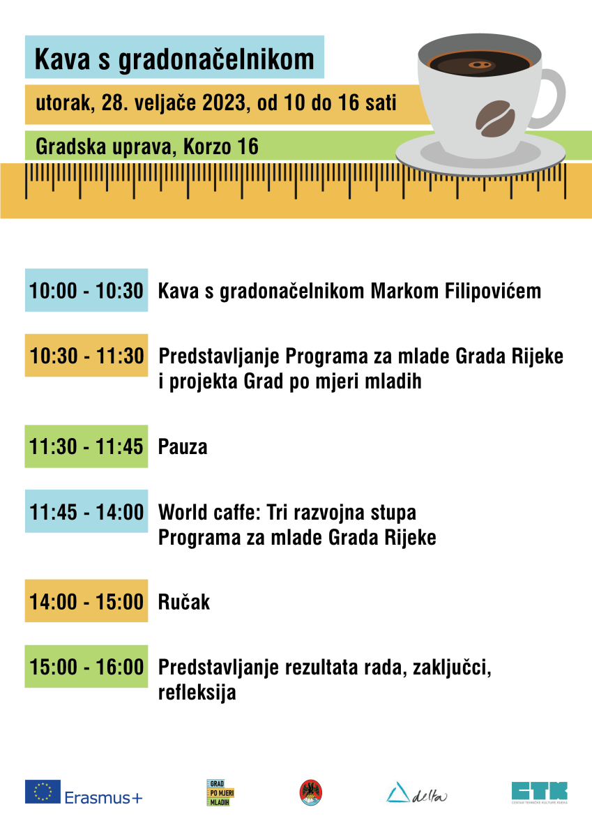 Projekt “Grad po mjeri” mladih u suradnji s Gradom Rijeka provode Centar tehničke kulture Rijeka i Udruga Delta. Projekt mladima u dobi od 15 do 30 godina nudi mogućnost da se aktivno uključe u Program za mlade Grada Rijeke. U sljedeće dvije godine planirano je čak 12 događanja, ali – prva je kava!