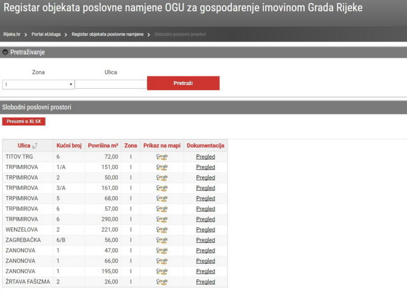 zakup poslovnog prostora Grada Rijeke, podaci o poslovnim prostorima