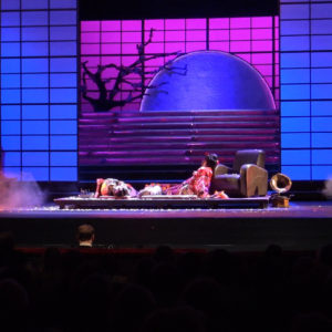 Radnja opere prati mladu Japanku koja je zaljubljena u lakomislenog američkog časnika koji izdaje njenu ljubav i povjerenje. Puccini je u ovoj operi spojio japanske glazbene utjecaje s tradicionalnom talijanskom melodioznošću, a cijelo djelo odiše sentimentalnom i toplom lirikom.
